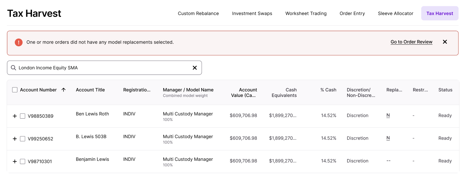 Crucially, this solution would allow for in-flow selection of model replacements without having to stop in the middle of tax harvesting clients’ losses.