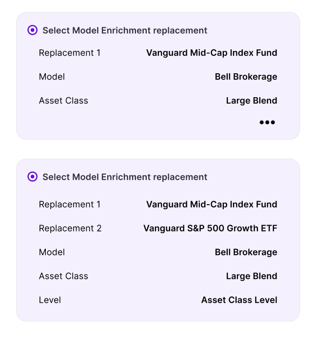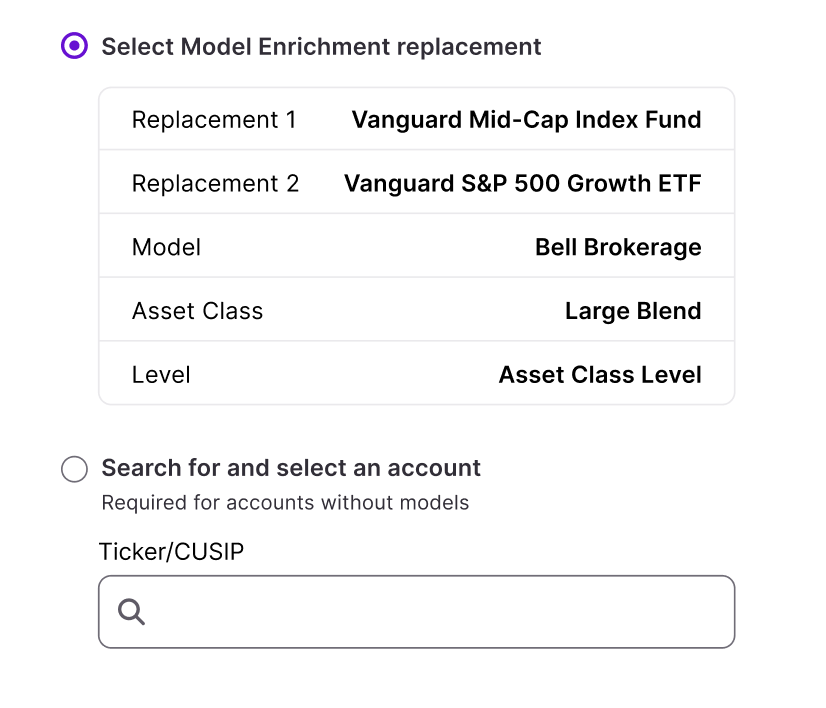 - They needed to be able to sell an account or sleeve and simultaneously be able to select or confirm a replacement financial model to buy instead.